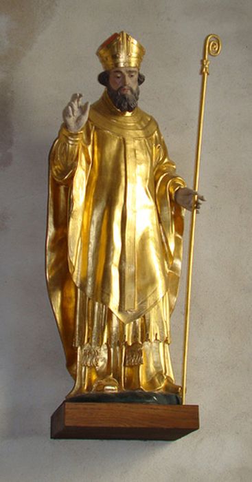 Saint Loup en tenue d'évèque mitré, tenant la mitre dans la main gauche, bénissant de la droite.