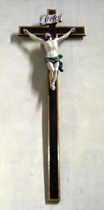 Christ en croix triomphant fixé sur la croix ; titulus INRI traité commun rotulus aux extrémités enroulés, fixé par un clou au centre.