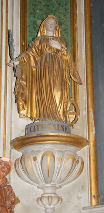 Sainte Catherine tient une palme du martyre dans la main droite, roue à terre sur son côté gauche, porte la main gauche à sa poitrine