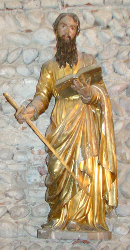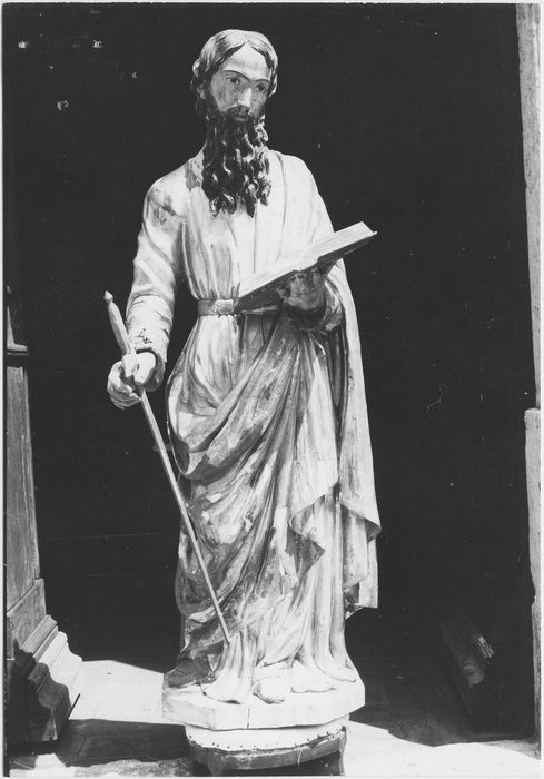 Saint Paul, à la longue barbe ondulée, tient une épée dans sa main droite, un livre ouvert dans la main gauche.