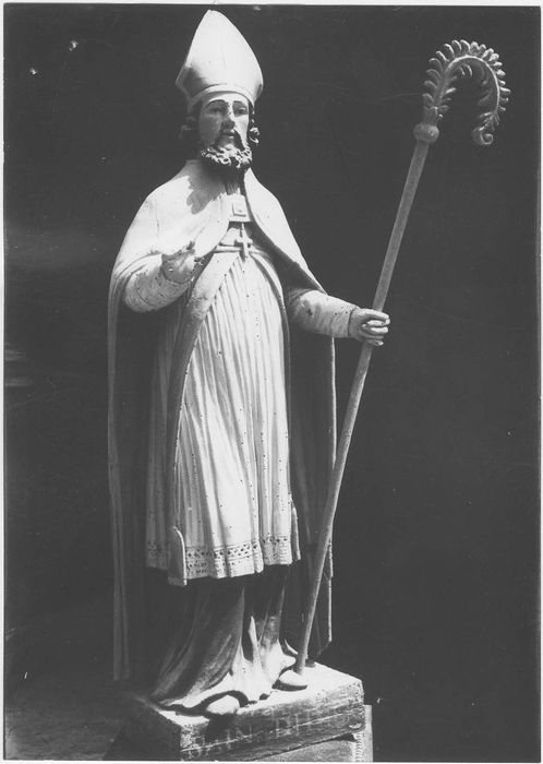 Crosse à réassembler ; main gauche à reconstituer ; avant bras droit à réassembler et main droite à restituer (?) ; devis de restauration réalisé par Arc-Nucléart en 2005 ; traitement au rayonnement Gamma et constat d'état établi par Arc-Nucléart en 2006-2007 : observation de la structure : le bois est profondément vermoulu. Cette dégradation a favorisé de nombreuses fractures et entraîné quelques manques ; cinq fragments résultant de ces dégradations sont conservés dans une enveloppe associée : l'avant-bras et l'amorce de la main droite. Un fragment comporte les doigts de la main droite. Il manque une partie de la main qui fait la jonction entre ce fragment et le précèdent (avant-bras). Ce fragment est particulièrement vermoulu et fragile. Une partie de la main gauche qui comporte quelques points de contact avec le poignet déjà en place sur le saint. Sur ce fragment, l'extrémité des doigts est manquante. Deux fragments s'assemblent pour former la partie supérieure de la crosse. En cas d'un éventuel remontage, il subsistera tout de même un petit manque au niveau de la boule de jonction avec le bâton. Le pouce de la main gauche est manquant. Un fragment du manteau, en bas, côté senestre est manquant. Le fragment présente des signes de fractures sur le plan vertical. Sur le plan horizontal, le fragment a été découpé. La découpe se poursuit horizontalement dans le manteau, jusqu'au corps du saint. Il est possible que cette découpe soit originale et que le saint ait été sculpté dans un bloc constitué de plusieurs morceaux de bois assemblés. Sur la semelle, à dextre, un fragment vermoulu est mobile. La base est fixée dans le prolongement de la semelle. Le système de fixation n'est pas connu (pas de clous visibles). De nombreux fragments sont maintenus par des clous. Certains clous sont encore recouverts de polychromie (sur la cape, juste au dessus du poignet droit) mais dans la plupart des cas, la corrosion a fait éclaté la polychromie qui recouvrait leur tête. Ces clous sont très nombreux et une radiographie X parait indispensable pour les localiser tous et mettre au jour leur état de conservation. Deux gros fragments de forme et dimension assez similaires forment les côtés droit et gauche du saint. Ils englobent chacun une partie de l'épaule, le bras et le pan de vêtement qui se trouve en dessous. Ces fragments sont délimités par deux longues fissures verticales : dans le dos et sur l'envers le long du corps. Les similitudes entre ces fragments semblent confirmer l'hypothèse d'une sculpture taillée dans un assemblage de morceaux de bois (à confirmer par la radiographie). Le bâton de la crosse est séparé. A l'origine il se glissait à travers un trou aménagé dans la main gauche et s'insérait dans un autre trou sur la semelle. L'ornement en forme de crosse (cf. fragments dans l'enveloppe associée) venait s'emboîter dans la partie supérieure du bâton. Sur la semelle, au niveau du pied gauche, le trou de logement du bâton de la crosse est vermoulu et comporte quelques manques. Observation de la surface : la surface présente un léger encrassement, plus prononcé sur les surfaces horizontales où l'on observe des accumulations de poussières. La polychromie présente peu de soulèvements, mais elle est parcourue par un réseau de microfissures. Un léger refixage pourrait être nécessaire au cours du nettoyage. Par ailleurs, l'observation sous loupe binoculaire montre un léger film brillant dans les lacunes de polychromie. Il pourrait s'agir d'un refixage antérieur. Les lacunes de polychromie sont essentiellement observées sur les parties saillantes, elles sont principalement dues à des frottements. Trois couches de polychromie sont visibles. Une étude de polychromie se révèle nécessaire.