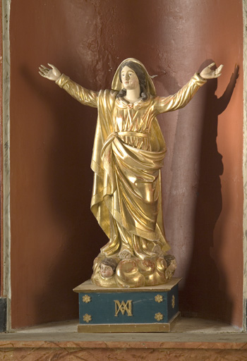 La Vierge, bras écartés et dressés, repose sur des nuées à têtes d'anges. Le socle est peint en bleu et or, avec monogramme AM et pastilles en forme de fleurette aux angles.