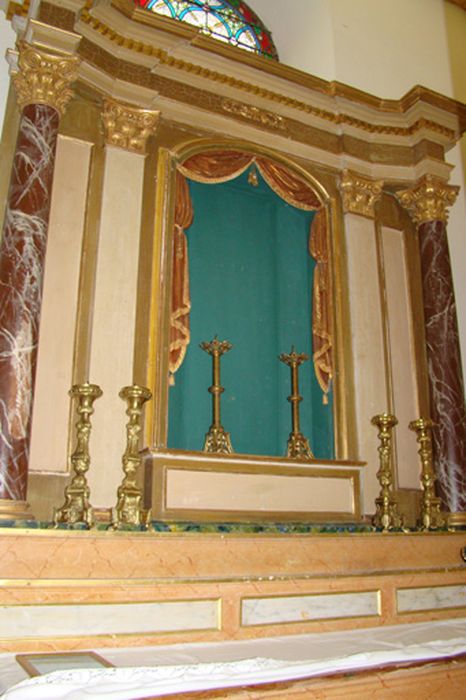 Autel en bois peint faux marbre de forme trapézoïdale avec devant d'autel décoré d'un médaillon avec monogramme IHS avec croix, drapé repeint en vert avec noeud doré au centre. Retable en bois peint en faux marbre, deux colonnes en faux marbre à chapiteaux composites dorés, deux pilastres. Gradin d'autel inférieur à décor de rectangles, gradin supérieur sans décor. Tabernacle avec porte cintrée sans décor. Statue en bois polychrome et doré. Saint Joseph tient une branche de lys, dorure mate sur sa robe, dorure brillante sur le contour.