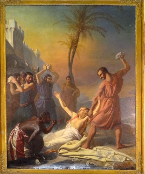 Saint Etienne ouvrant les bras est allongé à terre ; des hommes brandissent une pierre dans leur main ; palmiers, forteresse en arrière plan.