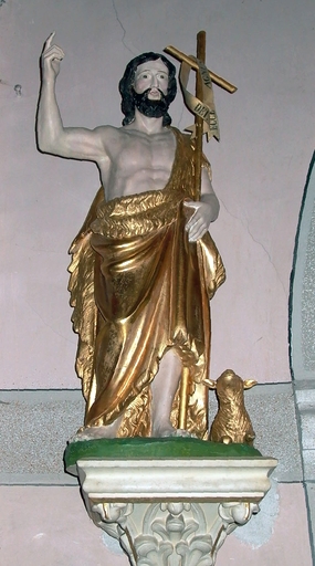 Saint Jean-Baptiste lève le gras droit, maintient un bâton avec un étendard dans sa main gauche, agneau à ses côtés.