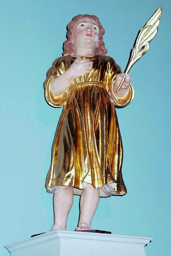 Saint Cyr représenté sous les traits d'un enfant, tient une palme du martyr dans la main gauche.