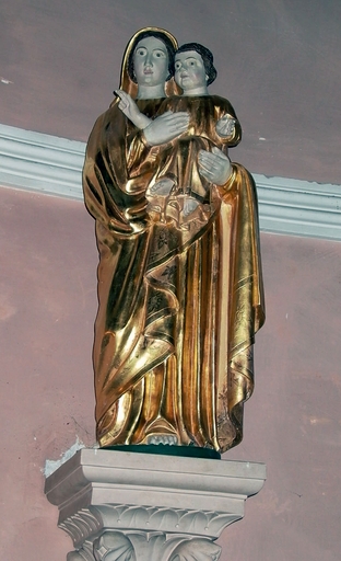 La Vierge maintient l'enfant Jésus assis dans ses bras devant elle.
