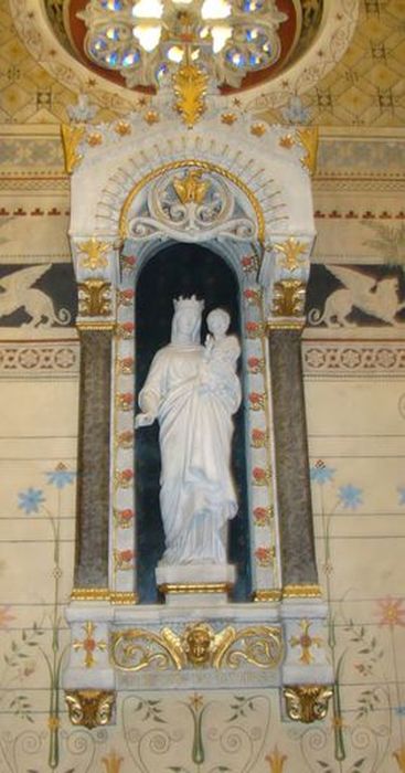Retable en marbre blanc à décor doré en stuc avec niche pour statue de la Vierge à l'enfant dite Notre-Dame des Victoires en pierre de grandeur nature. Retable avec dais néogothique formant une niche, en bas tête d'ange ailé, sur le pourtour roses roses e
