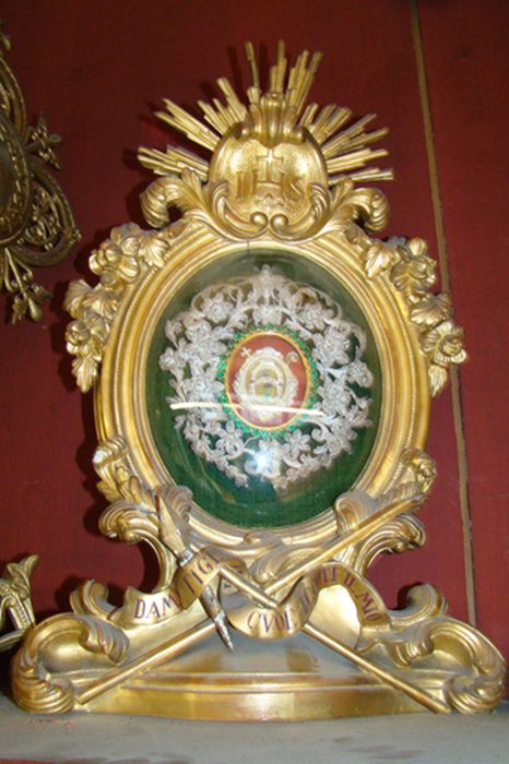 Reliquaire de forme ovale verticale à décor de rocaille ; au sommet, lettre gravées en relief IHS surmonté d'une croix dans un cartouche rayonnant ; dans le cadre : fond de velours vert, couronne de fleurs en métal argenté et reliques dans un médaillon ov