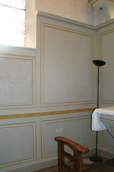 Panneaux rectangulaires peints en gris avec moulures peintes façon or ; partie basse à moulure à 4 rangs par raies ; une porte à gauche du mur ouest ; petit bénitier mural en pierre sur le mur nord.