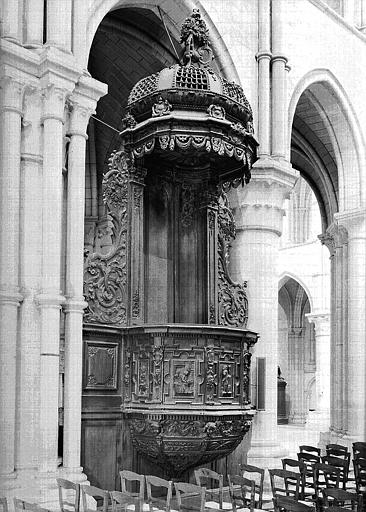 Tribune polygonale portée en encorbellement sur une paroi de bois plein, derrière laquelle est dissimulé l'escalier qui y donne accès. Le dossier, flanqué de deux consoles, supporte un abat-voix en forme de dôme à cinq pans ajourés.