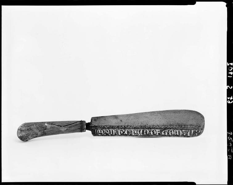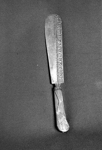 Manche en os et lame en acier, autrefois doré. L'inscription se terminait autrefois en forme de croissant. Un manche en os à spirales cannelées a remplacé l'ancien manche couvert de lames d'or ciselées.