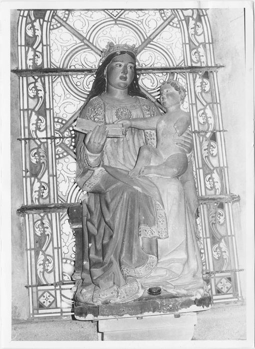 Vierge assise sur un trône maintenant l'Enfant assis, nu, sur le genoux gauche. Elle tient un livre ouvert sur lequel l'Enfant pose la main ; elle porte une couronne et son manteau au bord orfévré laisse apparaître la robe dont l'encolure travaillée est décorée d'un fermail rond.