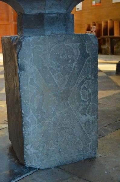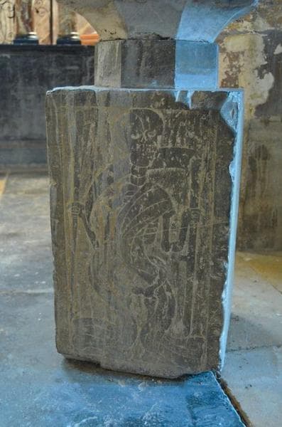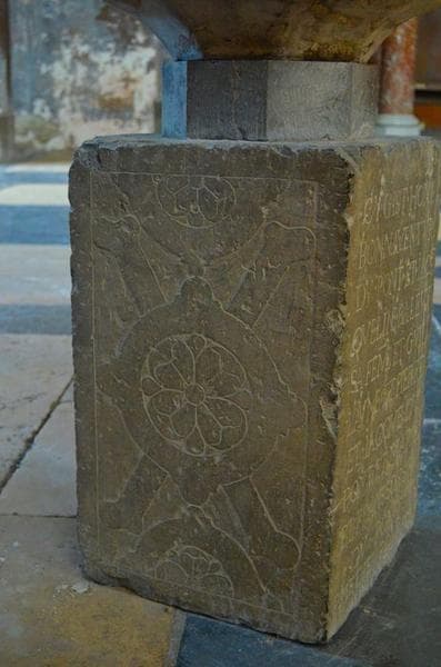 Le socle est une pierre funéraire sculpté en méplat réemployé.
