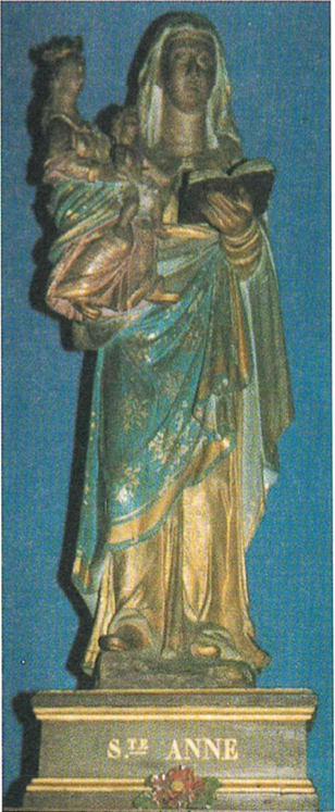Sainte Anne tient de sa main droite un livre, de l'autre elle porte la petite marie qu tient dans ses bras le petit Jésus.