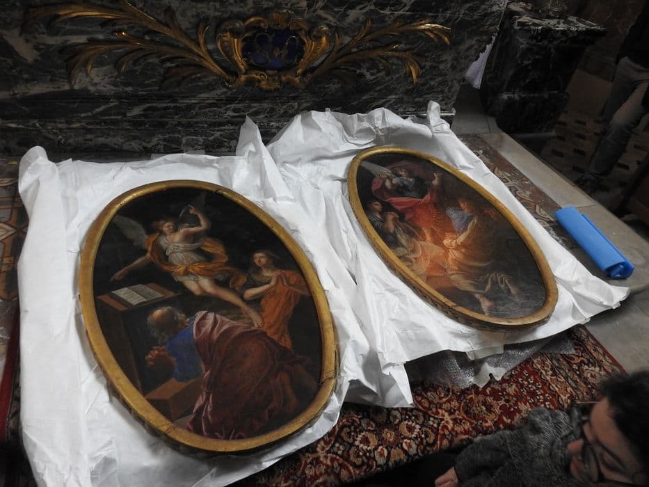 deux tableaux ovales : Légende de saint Crépin et saint Crépinien (dit Annonciation)