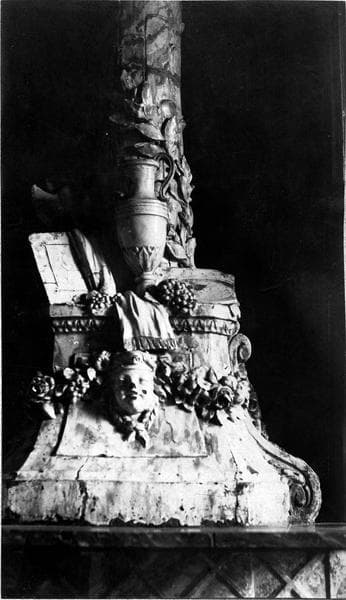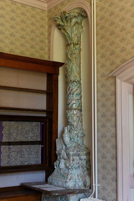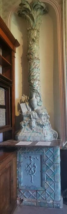 La fontaine est en pendant au poêle. Elle est composée d'un tronc de palmier (le tuyau) dont le soubassement est orné de guirlandes de fleurs ; et supporte des livres ouverts. Au centre est placé le robinet de la fontaine. Le tout est placé sur une haute console, dont la face principale est décorée d'un panneau ornementé. La faïence, dont l'ensemble est formé, est à fond blanc avec marbrures jaunes, vertes, bleues et violettes.