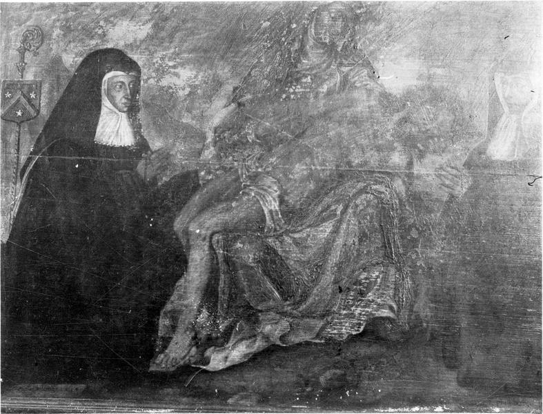 Deux religieuses sont représentées dont le nom est peint sous chacune d'elles : Philiberte Lelong à droite et à gauche : Gabrielle Lelong. A la droite du nom de cette dernière on lit la date 1614 et on voit un écusson aux armes de la famille Lelong.