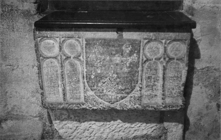 Cuve des fonts baptismaux. Cuve parallépipèdique fermée par un couvercle en bois articulé sur charnières.