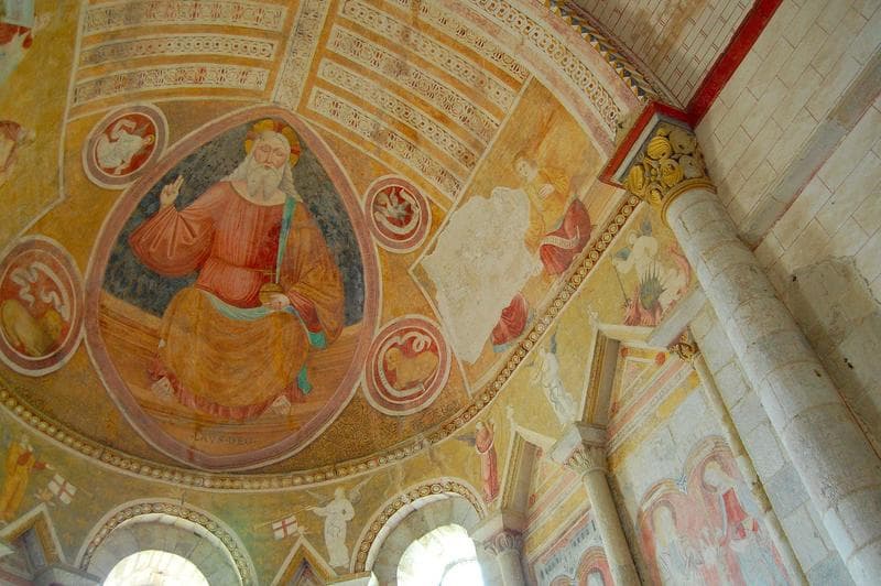 Dans le cul de four de l'abside est représenté un Christ en majesté entouré des symboles des évangélistes. Dans le choeur, entre les fenêtres, sont peints des figures de saints et de saintes de la fin du 15e siècle.