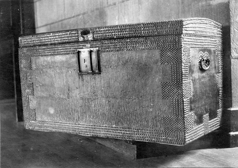 Coffre de forme quadrangulaire à couvercle bombé, en bois recouvert de cuir, garni de clous de cuivre et muni d'une serrure en fer, avec poignées latérales également en fer.
