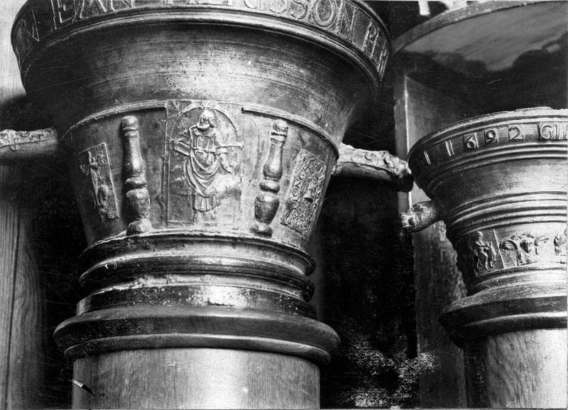La cuve est ornée de différents bas-reliefs à figurines, séparés par des pilastres en relief.