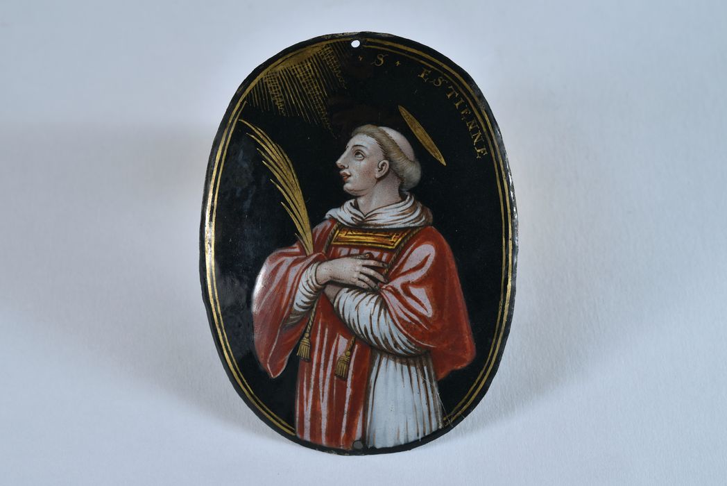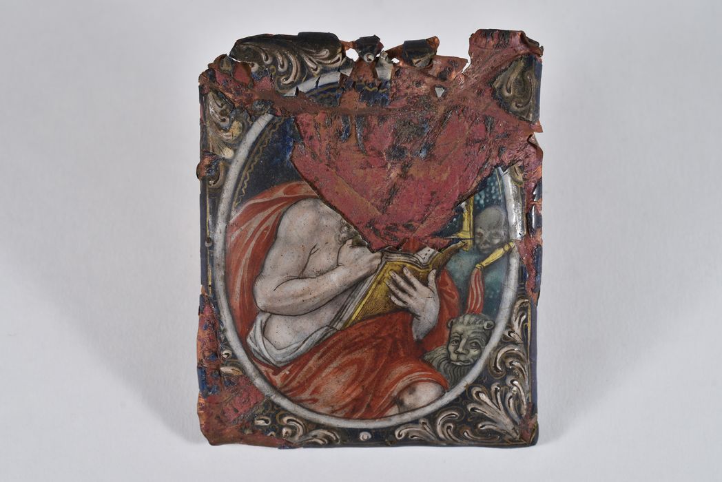 Email de Saint-Jérôme endommagé par l'explosion survenue le 23 novembre 1988 dans la sacristie de la cathédrale de Moulins.