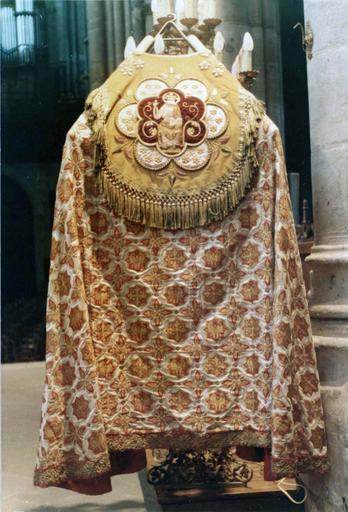 De chaque coté : trois personnages. Apotre ? dans un décor architectural. Cote 2C. Satin blanc à petits damiers et broderies de diverses couleurs.