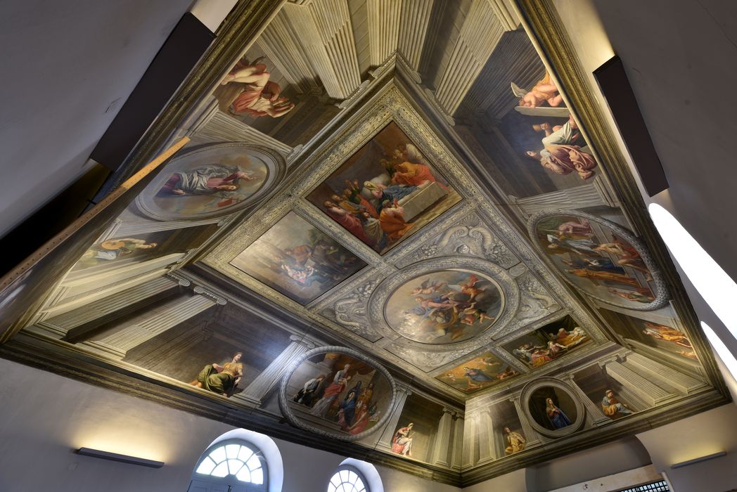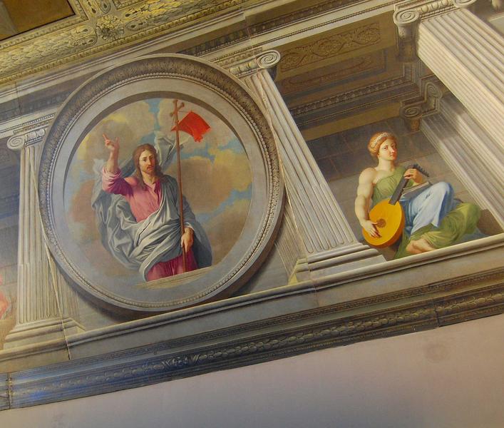 Rémy Vuibert, est né en 1607 dans les Ardennes. Après un passage dans l'atelier de Simon Vouet, il séjourne en Italie puis collabore avec Nicolas Poussin au chantier de la Grande Galerie du Louvre ce qui lui vaut le titre de 'peintre ordinaire du roi'. A partir des années 1641-1643, il se consacre essentiellement à la réalisation de grands décors peints et collabore avec l'architecte Le Muet II, il participe au décor du palais Mazarin, des hôtels Hesselin, La Vrillière ou d'Avaux de Saint Aignan à Paris. Il réalise aussi les décors en grisailles pour la grande galerie du château de Tanlay en Bourgogne. Le plafond peint de la chapelle des visitandines s'inscrit dans le courant de l'Atticisme parisien, courant qui se développe essentiellement à Paris dans les années 1640-1660 et qui puise son inspiration dans l'Antiquité et dans l'art de Raphaël et du Dominiquin, pronant un juste idéal de mesure et de grâce, des compositions rigoureuses, stables, un coloris clair, un art élégant. Vuibert reprend des techniques qu'il avait déjà utilisées sur ses autres chantiers telles que la grisaille, très en vogue à l'époque, ou les pilastres cannelés en perspectives. Il meurt en 1652. La réalisation de ce décor était anciennement attribuée au peintre Eustache Le Sueur, artiste mort en 1655.