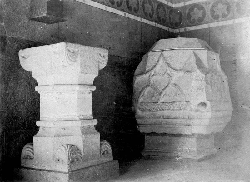 Fonts baptismaux paraissant formés d'un ancien chapiteau renversé.