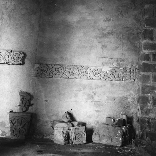 Oeuvre déposée. Ces fragments de sculpture proviennent des réparations de l'église et de l'ancien cimetière. Un bas-relief en pierre du 12e siècle représentant une frise de rinceaux volé fin 2007 - début 2008, a été retrouvé en 2012.