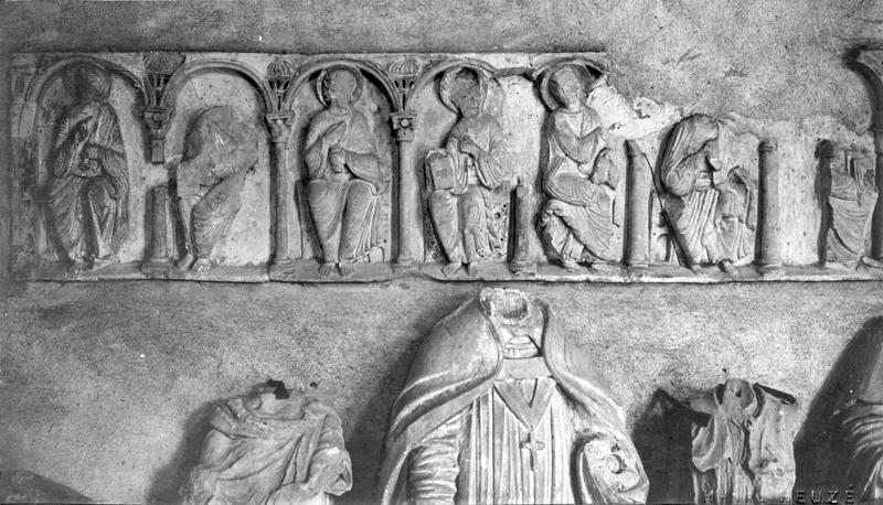 L'arrêté indique : Fragments de sculptures déposées sous le porche, pierre, 12e siècle.