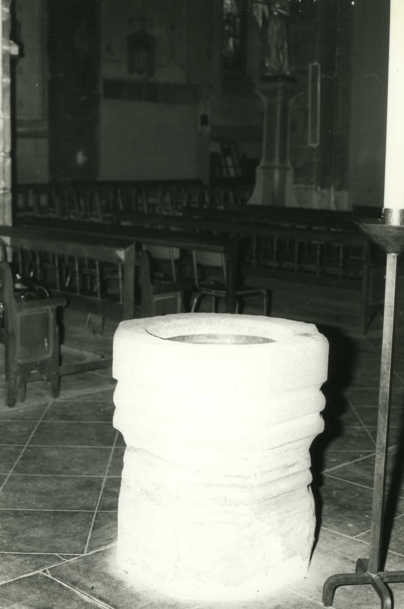 La pierre étant très poreuse, ce bénitier a été garni d'un intérieur de plomb, pour éviter qu'il n'absorbe l'eau.