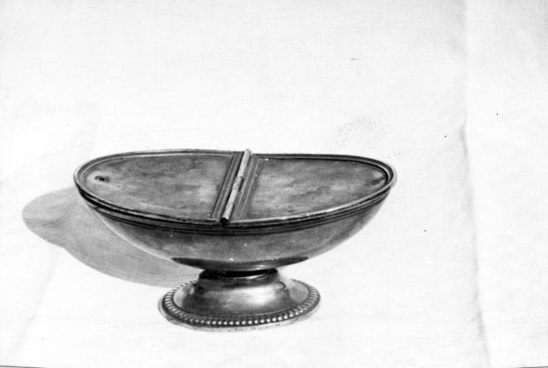 Coupe en forme de demi-oeuf. Couvercle plat dont une moitié s'ouvre en tournant autour d'une charnière.