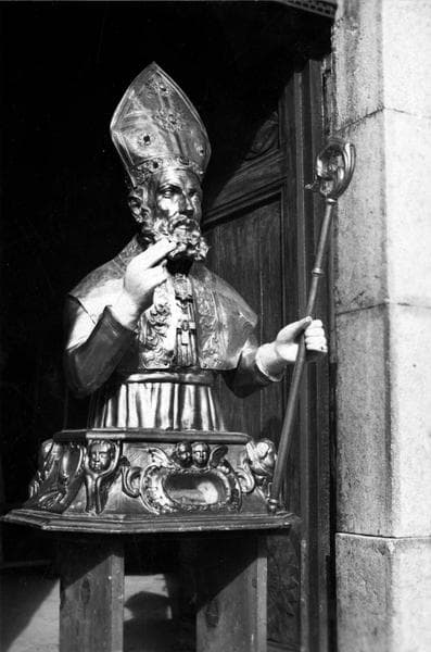 Le saint est représenté à mi-corps, mitre et tête en argent, chape de cuivre et le reste est en bois peint.