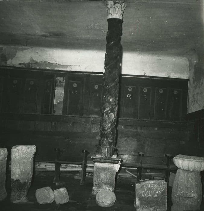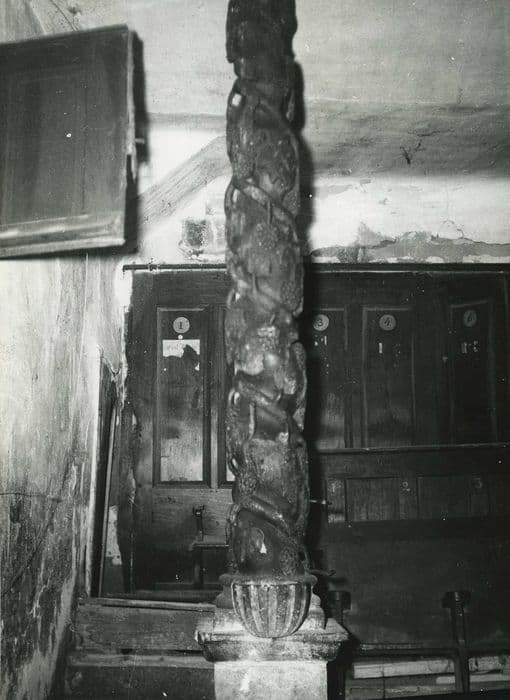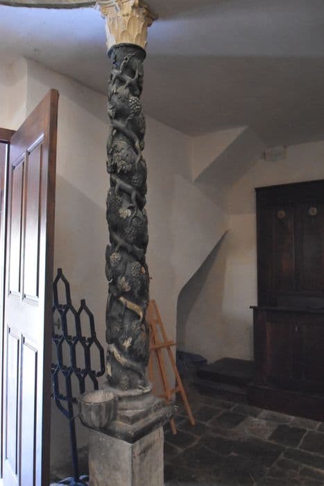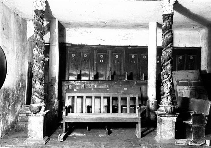 Les chapiteaux sont décorés de feuillages stylisés et les colonnes, de forme torse, sont ornées de pampres et d'oiseaux.