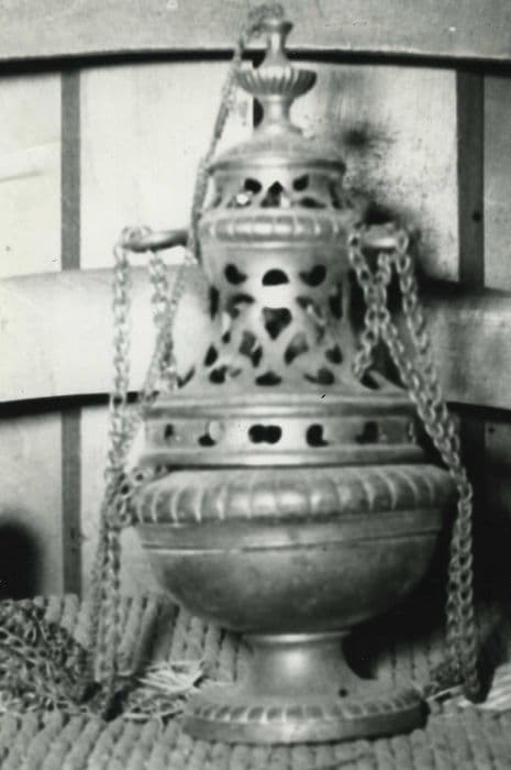 La partie supérieure de cet encensoir est ajourée et la partie inférieure est pleine, avec des renflements cannelés.