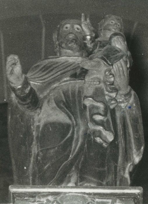 Statue de saint Joseph portant l'Enfant dans son bras gauche. Le saint devait tenir à l'origine une fleur de lys dans sa main droite. Sur le socle, sont sculptés des instruments de menuisier ou de charpentier.