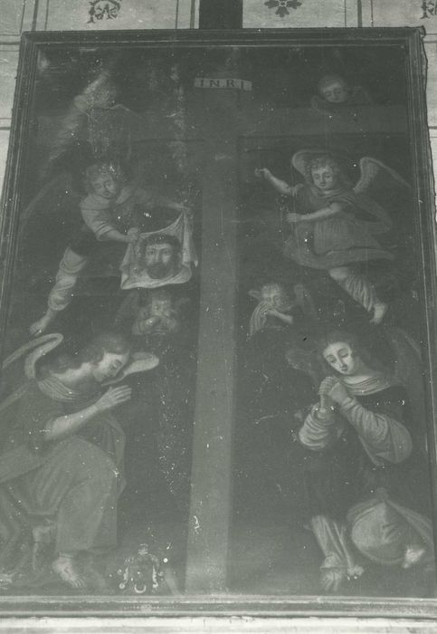 Représentation de la croix entourée d'anges priant ou tenant les Instruments de la Passion ainsi que le suaire avec la Sainte Face.