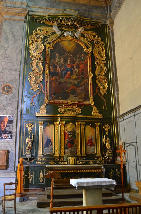 retouche : signature en face de L. COURT ANNO 1719, EYMAR DE BRIANÇON. Le récolement de 2019 indique : Le tableau est inséré dans le retable de l’autel du saint Esprit, bras nord du transept. Il porte en partie inférieure à gauche l’inscription suivante : « L. COURT/AN° 1719 ».
