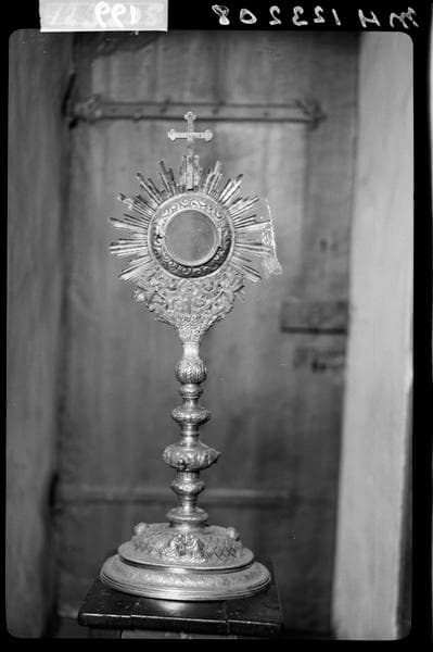 Autour de la montre : nuée et chérubins reposant sur un motif décoratif avec pampres de vigne, épis de blé et palmettes. Sur le noeud et les collerettes : multiples décors (saint Joseph).