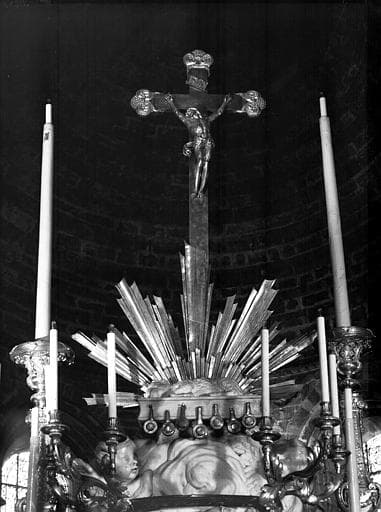 Croix sur rais flamboyants surmontant le tabernacle du maître-autel. Six grands chandeliers et six chandeliers de taille moyenne garnissant le maître-autel. Deux torchères accostant le tabernacle.