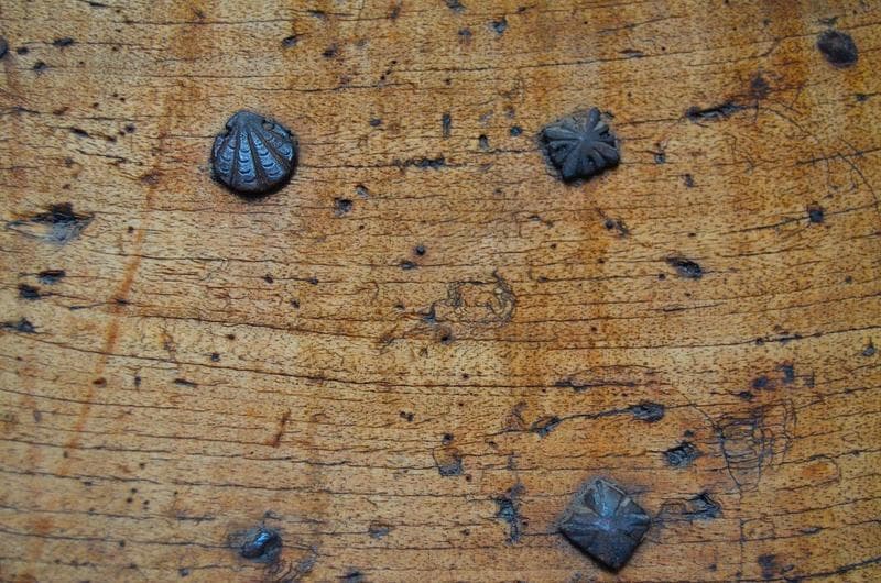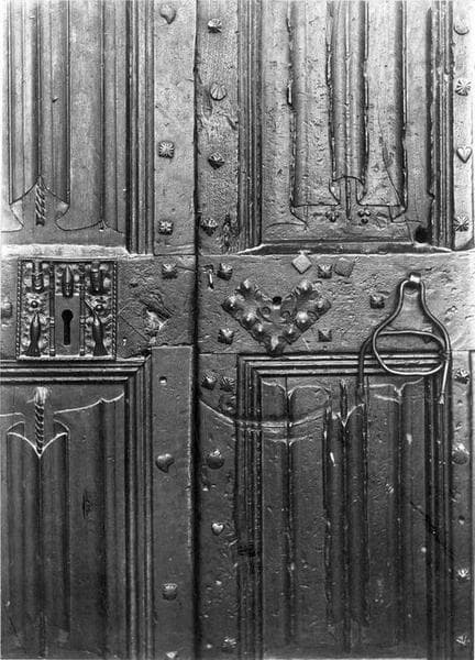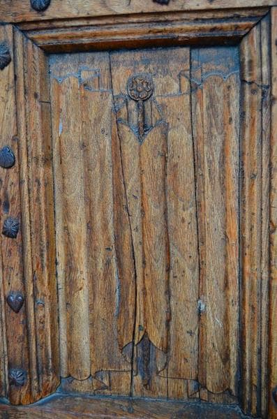 Vantaux : 18 panneaux décorés de draperies, 6 d'entrelacs gothiques, monogramme I H S ; serrure : 3 têtes barbues coiffées de mitres et de tiares, 2 oiseaux ; porte constellée de clous dont les têtes représentent des coeurs, des coquilles, des fleurs de lys, des dauphins.