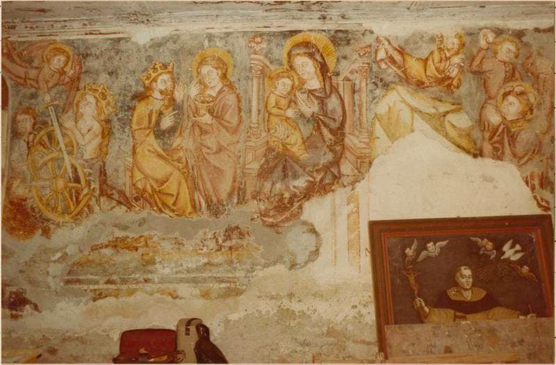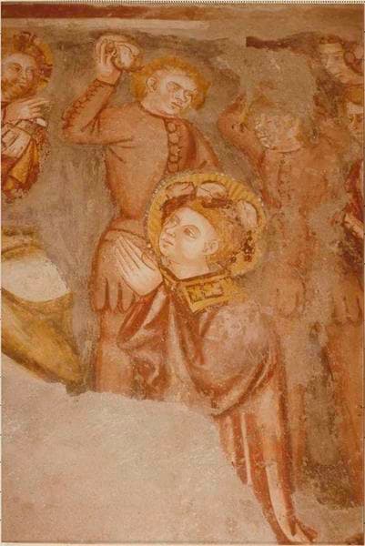 Christ en majesté et symboles des Evangélistes ; apôtres ; Annonciation ; saint non identifié ; saint musicien ; sainte Marguerite issant du dragon ; le Repas chez Simon ; martyre de sainte Catherine d'Alexandrie ; jugement de sainte Lucie ; la Vierge et l'Enfant ; lapidation de saint Etienne ; une tentation de saint Antoine ; investiture de saint Vincent par saint Valère ; mission de saint Vincent ; arrestation de saint Vincent et de saint Valère ; martyre de saint Vincent ; mort de saint Vincent ; saint Vincent livré en pâture aux bêtes féroces ; immersion de saint Vincent.