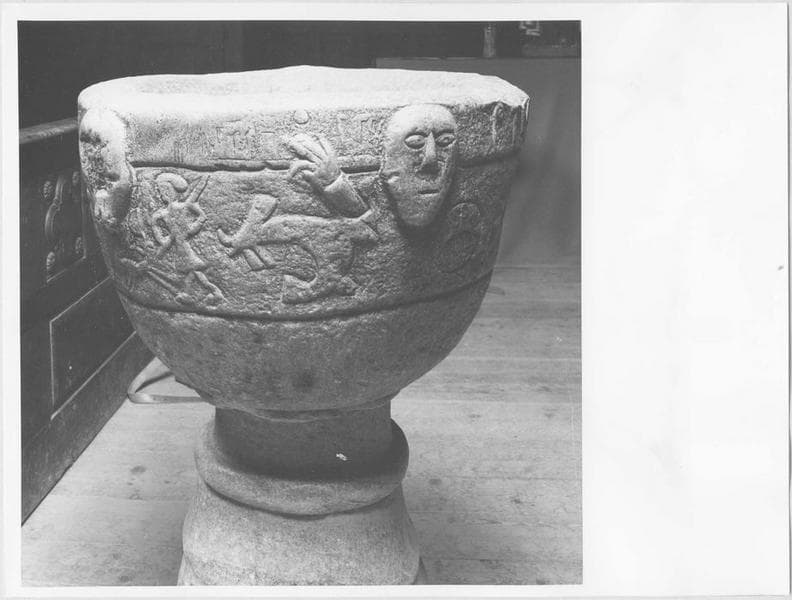 Vasque : quatre têtes en relief, partie supérieure ornée d'une petite tête, une crosse, une croix et une mitre ; partie intermédiaire : un dragon, un bras et une main bénissante, un guerrier et un autre personnage portant une lance, devant lui un chien ou un lièvre, un niveau de maçon, un tau, deux personnages face à face et se donnant la main, une étoile à cinq pointes, un soleil et peut-être un disque solaire, piédestal à triple moulure.