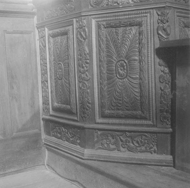 Panneaux : rinceaux, volutes, fleurs stylisées, feuillages, frise de feuilles de laurier ; montants : personnages à tête de diable tenant une corne d'abondance d'où s'échappent fruits, fleurs et feuillage.