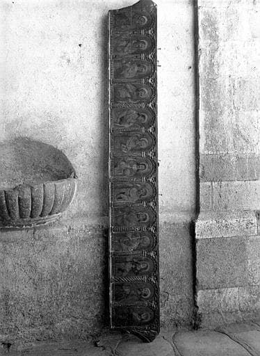 Panneau peint avec arcades sculptées : décor architectural en bas reliefdans la masse ; polychromie ; préparation épaisse blanche recouverte de rouge sur le décor architectural ; préparation blanche perceptible sous le décor peint ; deux consoles de bois clouées au revers