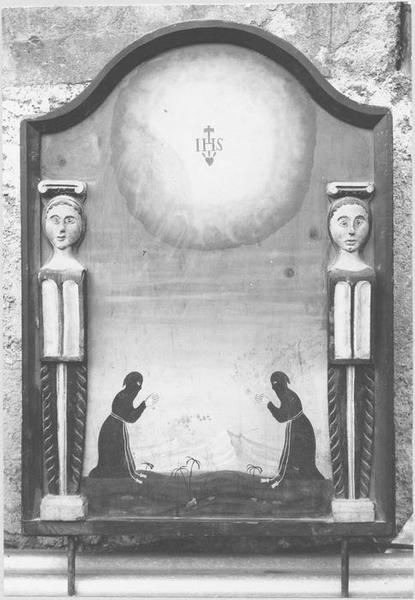 Face : deux pénitents agenouillés face à face dans un paysage de montagnes, nuée sur laquelle se détache le sigle I H S, une croix et un coeur percé de trois clous (peinture) : deux cariatides (sculpture) ; revers : Christ en croix dans un paysage identique au précédent.