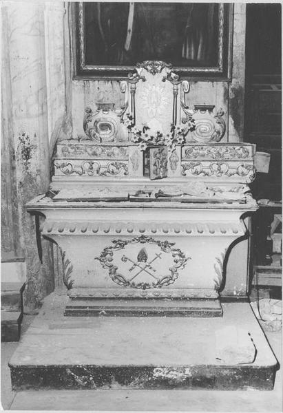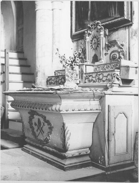 Crosse, croix et mitre (face antérieure de l'autel), fruits de la terre (sur le tabernacle), I.H.S.rayonnant (sur le panneau au-dessus du tabernacle) entre deux colonnettes encadrées d'ailerons, saint Eloi (statuette).