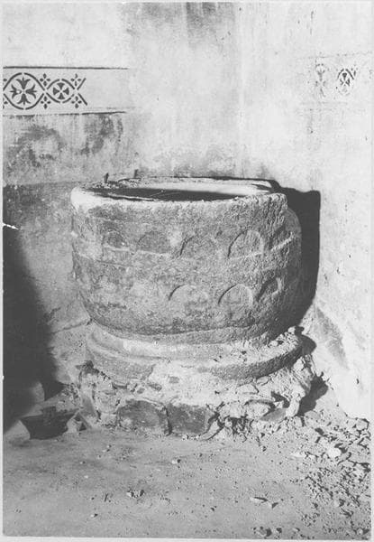 h = 67 ; la = 55 ; dimensions du bénitier ; support : h = 47, la = 28 ; cuve : h = 20, d = 41